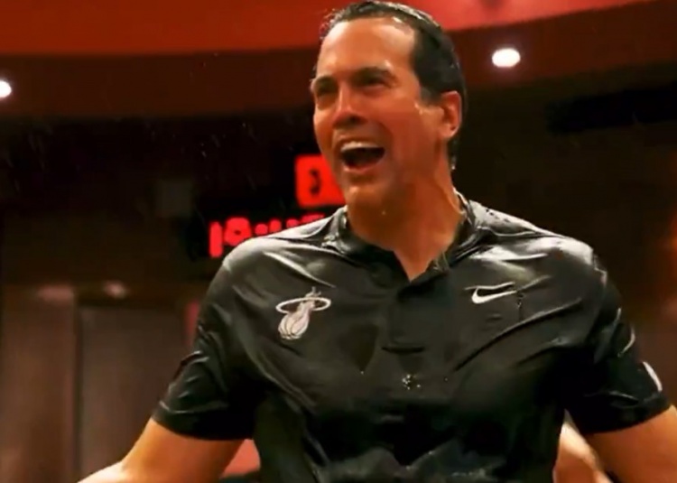 11月27日讯 NBA杯小组赛,热火主场106-103战胜雄鹿。这是热火主教练斯波生涯的第800场胜利,他是历史上第17位达成800胜的主教练。值得一提的是,斯波本人一开始并没有意识到,他在回到更衣室后被队员疯狂浇水庆祝,还问道:“这是为啥?”队员们表示这是为了庆祝他执教生涯800胜。GIF-斯波被浇水庆祝