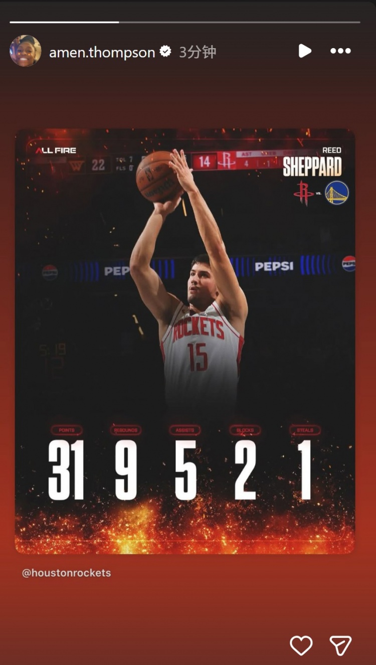 11月27日讯 NBA杯C组小组赛,火箭104-100逆转勇士。赛后阿门·汤普森在INS上转发了今天谢泼德的数据海报。谢泼德全场比赛出战38分钟,24投12中,三分球12中4,4罚3中砍下了职业生涯新高的31分外加9板5助1断2帽;阿门在38分钟的时间里,投篮12中4,三分球3中0,罚球2中2,拿到10分14篮板3助攻1抢断。