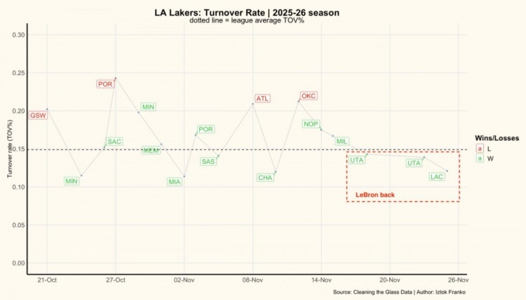 备注:虚线为联盟平均线,绿色为赢球比赛失误率,红色为输球比赛失误率失误率:记录球员在场时失误次数与总持球数的比值。(球队失误率 = 球队失误数 / (球队投篮出手数 + 0.44 × 球队罚球数 + 球队失误数)