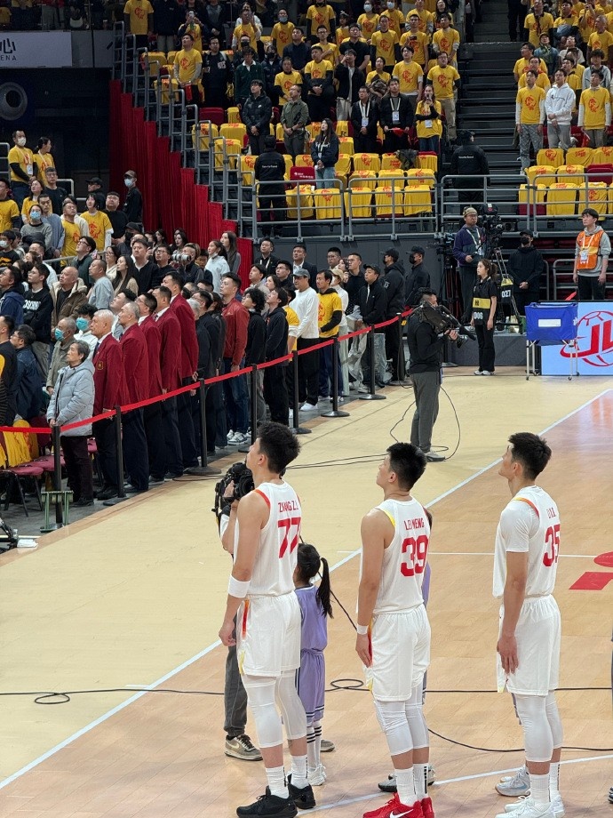 赛前我拍下的第一张照片,男篮将士们的远端,是蒋兴权、匡鲁彬、巩晓彬、胡卫东、王治郅等中国男篮传奇名宿。五棵松上万观众的山呼海啸,前辈们场边督战,是动力,同样也是压力。
