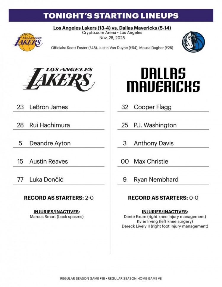 湖人首发:东契奇、詹姆斯、里夫斯、八村塁、艾顿。