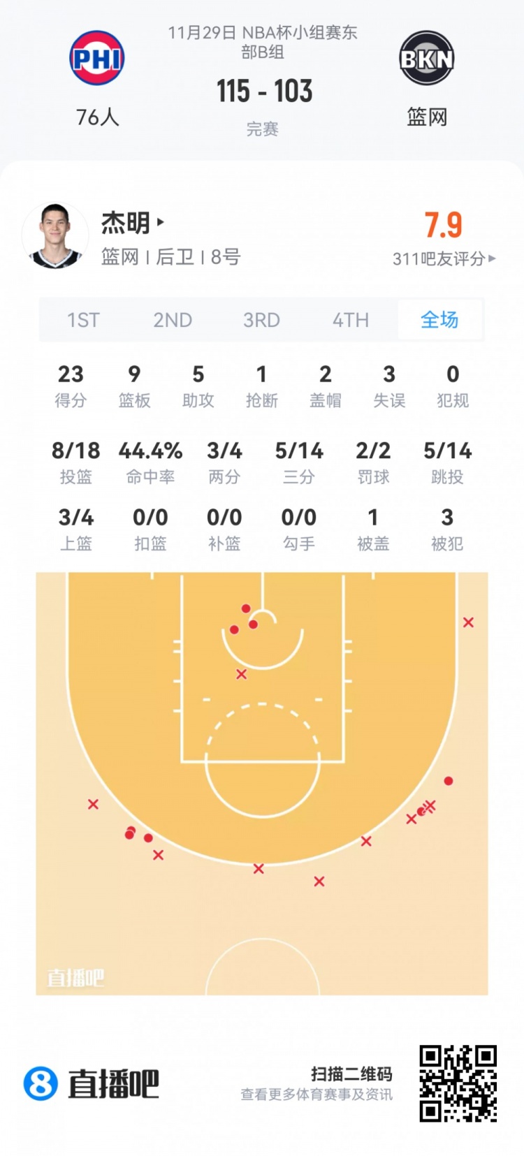 篮网首轮8号秀叶戈尔·杰明 登场30.5分钟