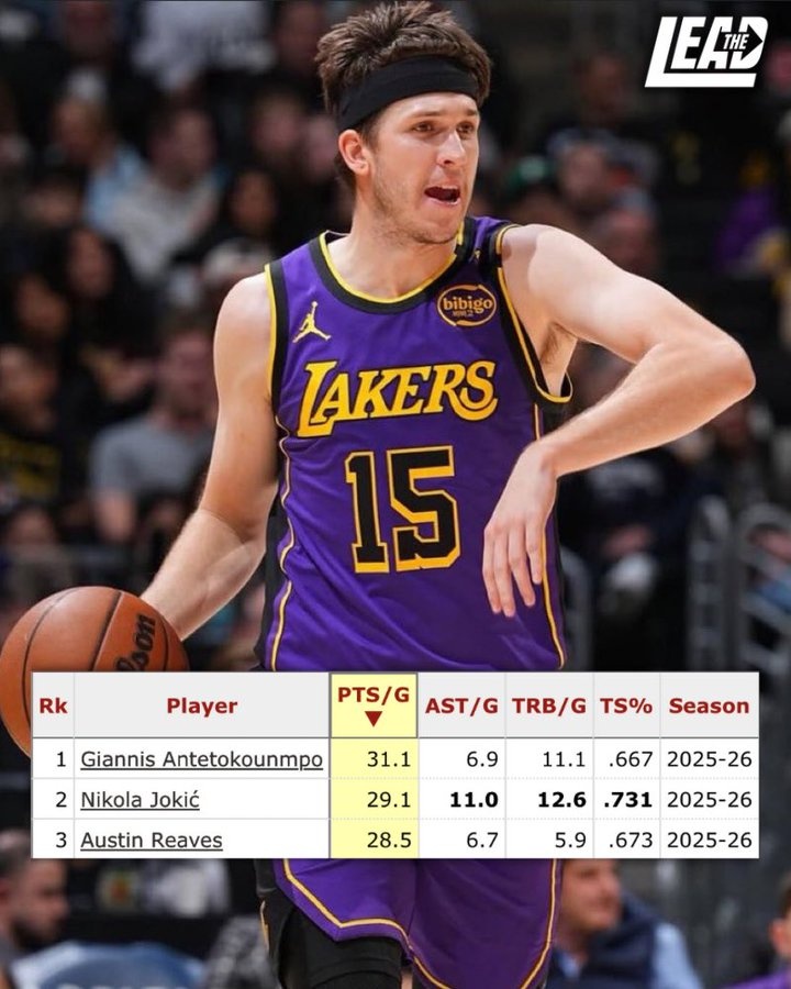 11月30日讯 美国数据媒体The Lead分享了一个数据,赛季至今只有三名球员能场均28+5+5且真实命中率65+%。约基奇:29.1分12.6板11助,真实命中率73.1%字母哥:31.1分11.1板6.9助,真实命中率66.7%里夫斯:28.5分5.9板6.7助,真实命中率67.3%