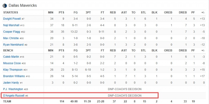 此役,独行侠后卫德安吉洛·拉塞尔还是没能获得出场机会,连续两场(洛杉矶之旅)被DNP。