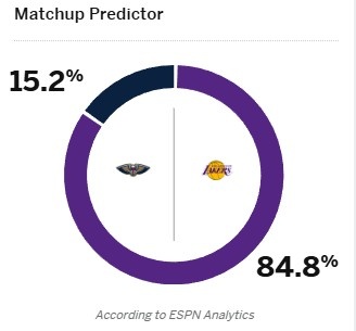 没有悬念?ESPN预测明日胜率:湖人高达84.8% 鹈鹕仅为15.2%