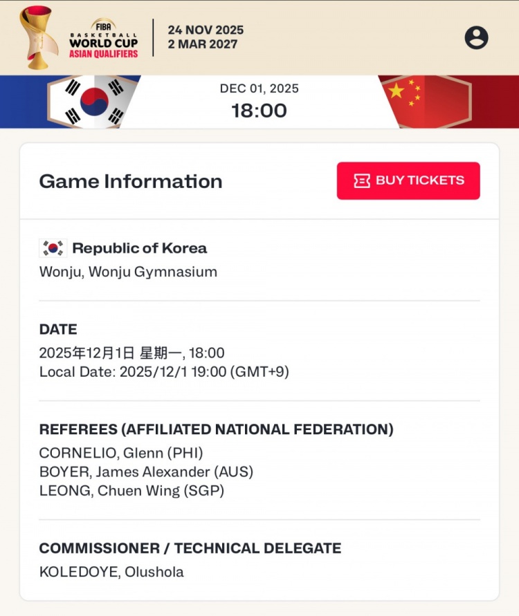 11月30日讯 明晚18:00,中国男篮将在客场再战韩国男篮。媒体人@球圈赵探长报道明天比赛的裁判安排:“明日世预赛中韩二番战裁判来自菲律宾、澳大利亚和新加坡,其中新加坡裁判梁俊容执裁过CBA,官网球员名单暂无变化。另外,中国裁判孙健担任澳新二番战主裁,两个我们熟悉的韩国知名裁判担任他的副手。”