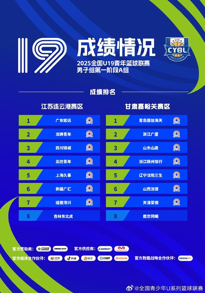 成绩公布丨2025年全国U19青年篮球联赛男子组第一阶段。U19联赛男子组第一阶段比赛已全部结束,根据规则,A组两个赛区的前7名以及B组赛区的前2名,共计16支球队成功晋级决赛阶段。具体成绩如下: