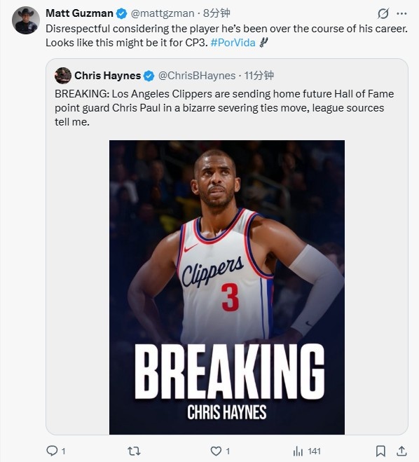 12月3日讯 名记Haynes报道称:联盟消息人士向我透露,洛杉矶快船队正以一种离奇的解约方式,送走未来的名人堂控球后卫克里斯·保罗。马刺记者Matt Guzman对此点评道:“考虑到保罗所拥有的职业生涯,这缺乏尊重。保罗的事情看起来就是这样了。”