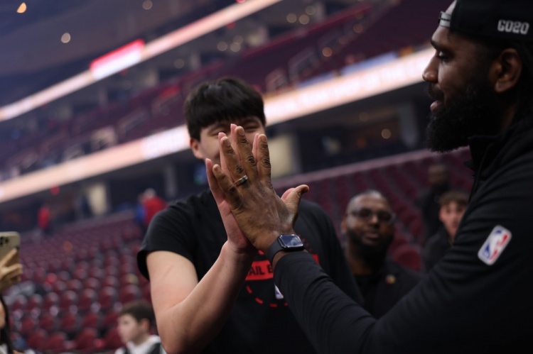 前辈的教导!奥登观战开拓者vs骑士 赛前与杨瀚森合影致意