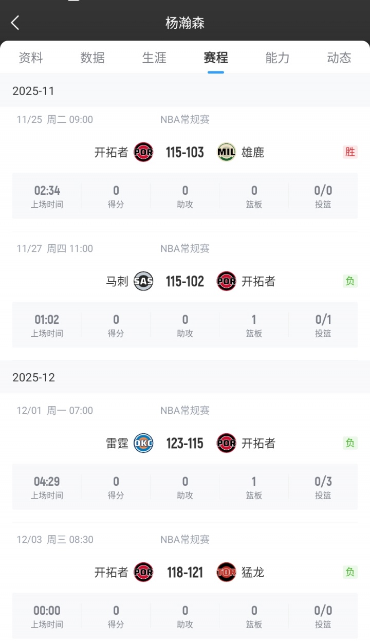 12月04日讯 NBA常规赛,开拓者背靠背客场122-110击败骑士。此役开拓者替补中锋罗威轮休。而中国球员、开拓者新秀中锋杨瀚森仅在首节收获出场时间,但是没有太多的触球机会。他全场比赛出战5分14秒,没有运动战出手,仅依靠罚球拿到2分1篮板1助攻1盖帽的数据。正负值+5。在此前的4场比赛,杨瀚森均没有得分。