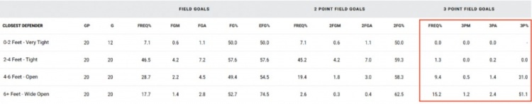 和那些好高骛远、追求时髦的家伙们不同,本赛季杰伦-约翰逊并没有盲目增加持球投射,相反,他基本只投那些被对手选择性放空的机会,在大空位(6英尺开外)的情况下,他的三分球命中率高达51%,有近六成的三分出手皆来自于此,而其他四成则发生在相对空位(4-6英尺)的情况下,命中率会骤降至31.0%,除此之外,在有人防守到位的情况下,他基本就不会出手。