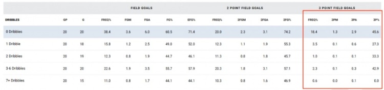 显而易见,杰伦-约翰逊的四成三分球命中率并不能代表他正在接近那些精英级别的成名射手,他的三分投篮也主要以定点投篮为主,一步球不运的远射在三分出手里占了将近七成,应用条件极为单一。