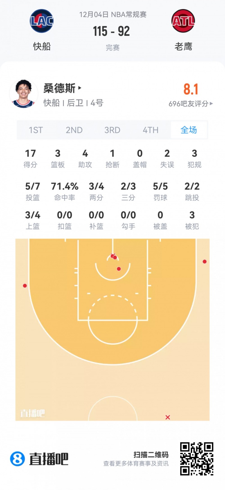 快船次轮50号秀科比·桑德斯 登场27.2分钟