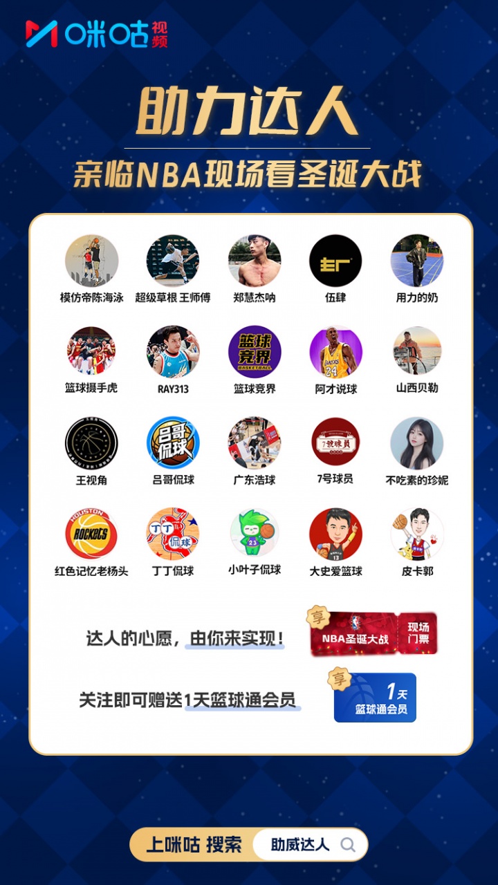 @全体吧友,NBA又有新活动了!点击链接关注达人,直接领1天咪咕篮球通VIP!还能送达人飞美国看圣诞大战!抽奖观赛两不误~(戳下方活动入口参与活动)