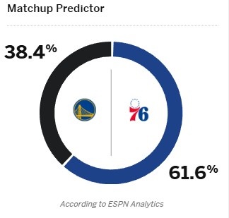 12月4日讯 明日NBA常规赛,76人主场迎战勇士。ESPN今日给出本场胜率预测,勇士仅为38.4%,76人为61.6%。人员方面,勇士的巴特勒(膝盖)、库明加(脚踝)、霍福德(坐骨神经)、波斯特(脚踝)和TJD(膝盖)出战成疑,库里缺阵,梅尔顿复出。76人这边,恩比德(右膝伤势恢复)小概率出战,保罗·乔治(膝盖/背部伤势)、格莱姆斯(小腿伤势)出战成疑。