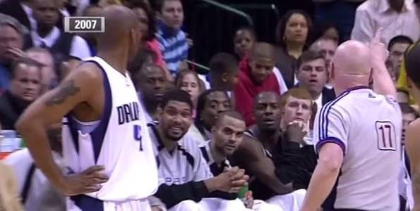 2007年4月15日,在马刺对阵小牛的比赛中,邓肯在替补席大笑被克劳福德吹T,累计2T的邓肯被驱逐。