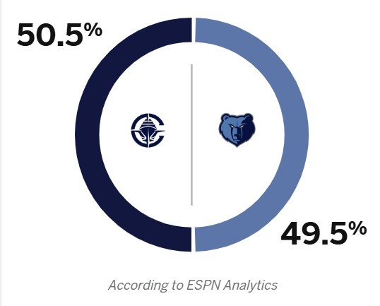 ESPN预测本场比赛胜率,快船50.5%,灰熊49.5%。