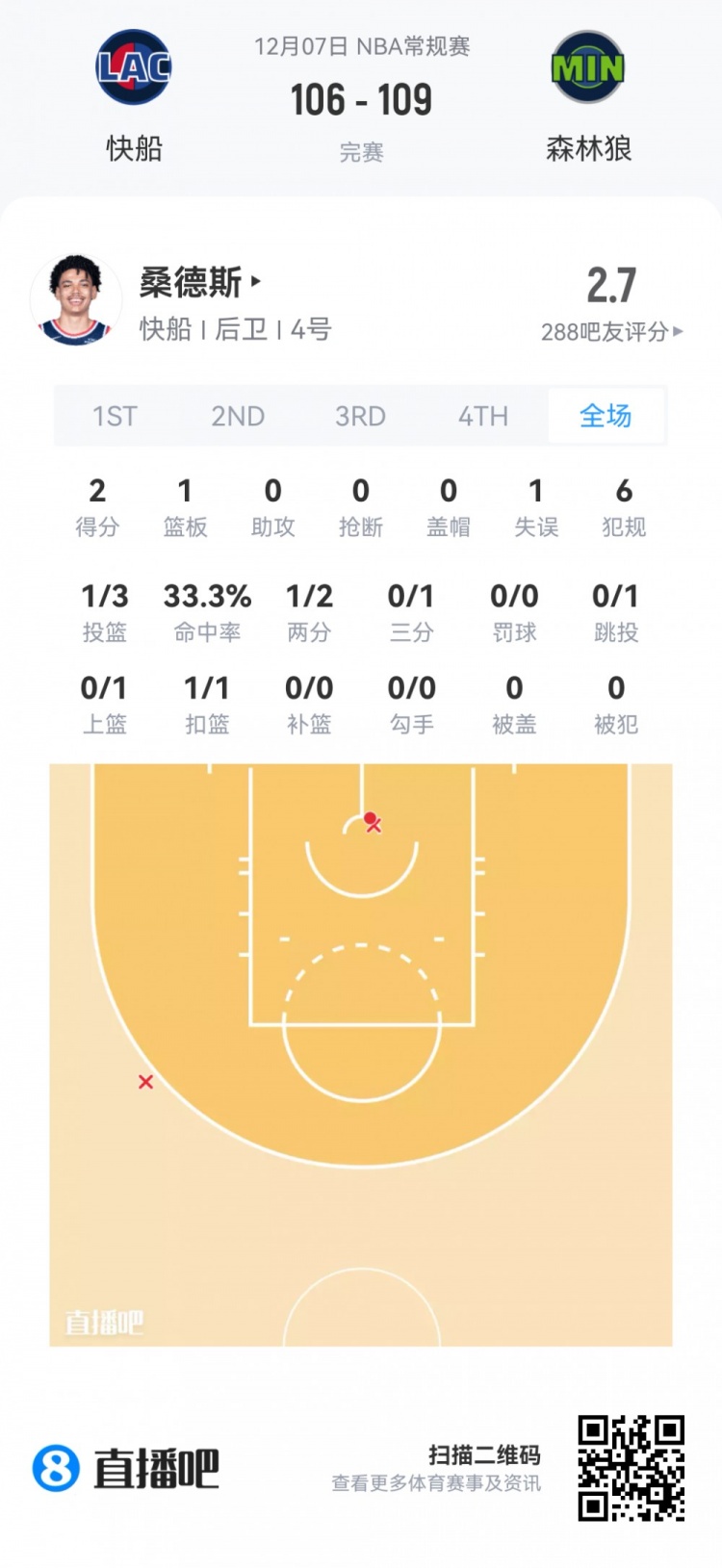 快船次轮50号秀科比·桑德斯 登场15.5分钟