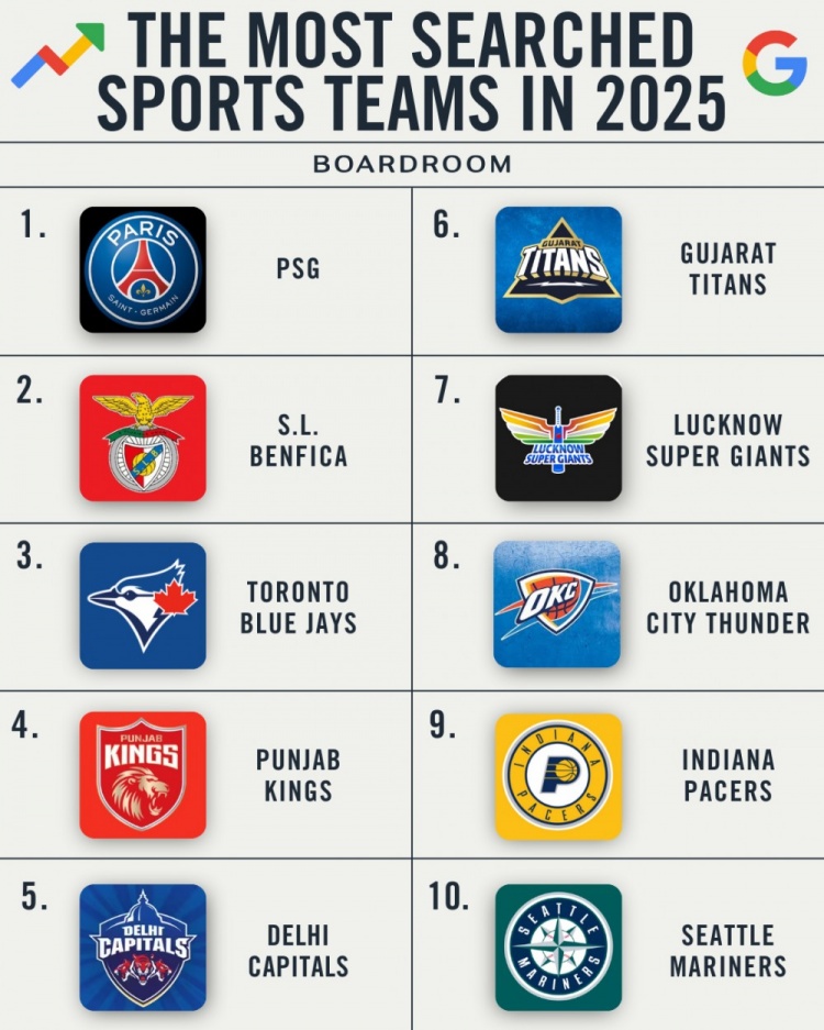 12月7日讯 根据Google搜索引擎数据显示,2025年被搜索最多的10支体育俱乐部。其中2025年打入总决赛的雷霆和步行者挤进了前十。