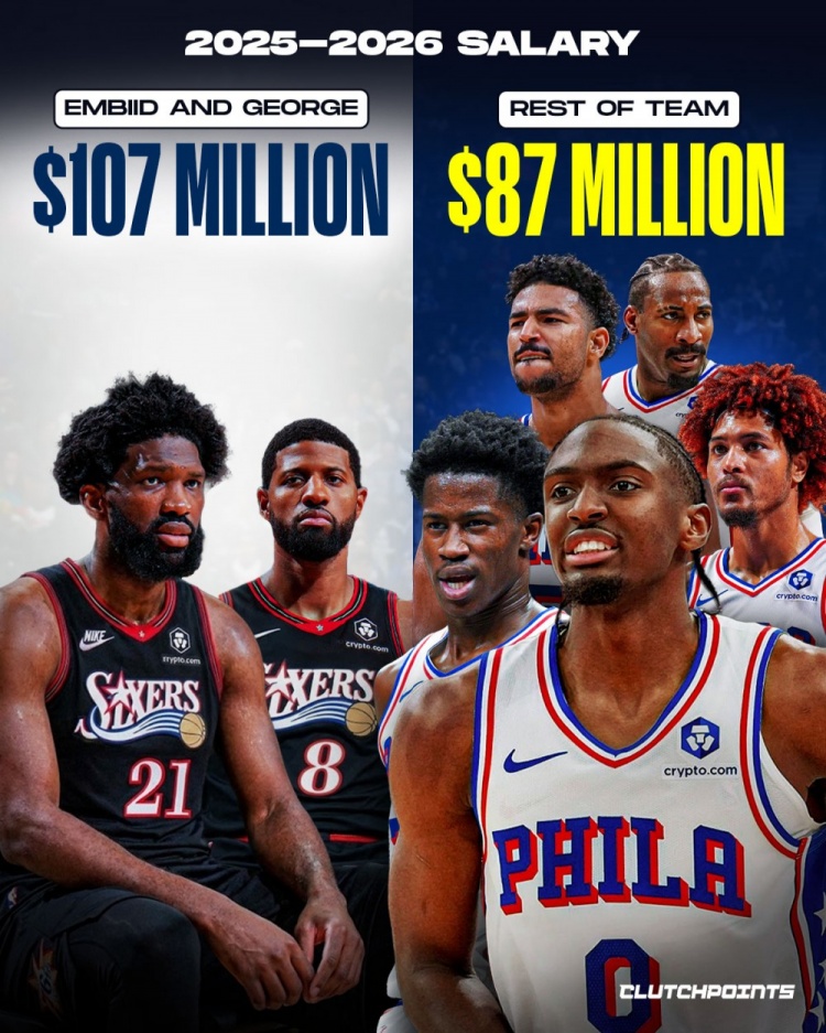 美媒ClutchPoints晒图写道:76人队将55%的工资总额花在了两名出场时间不到一半比赛时间的球员身上。费城将乔尔·恩比德和保罗·乔治列入名单,主要是为了让他们得分。本赛季至今,两人每场比赛的得分仅占全队得分的27%。还不到他们占据球队工资份额的一半。