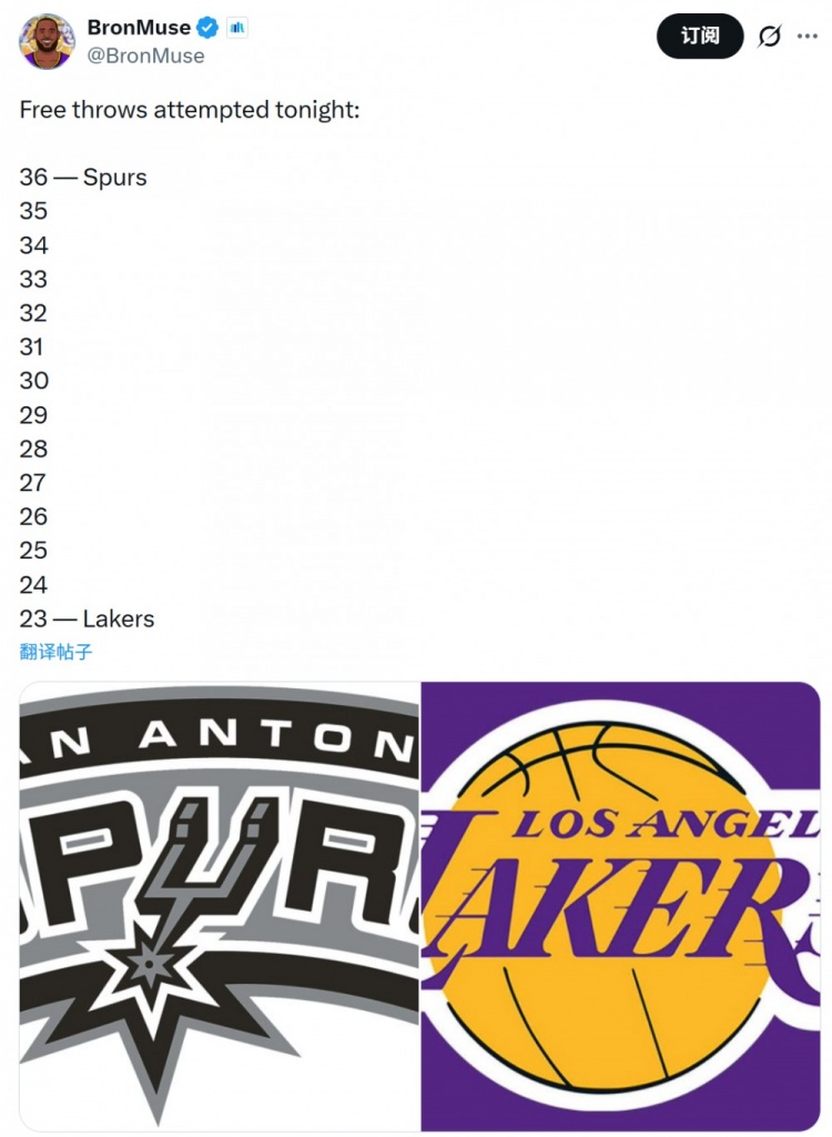 赛后湖人媒体BronMuse晒出了本场罚球数对比:马刺36罚(23中)、湖人23罚(17中)。
