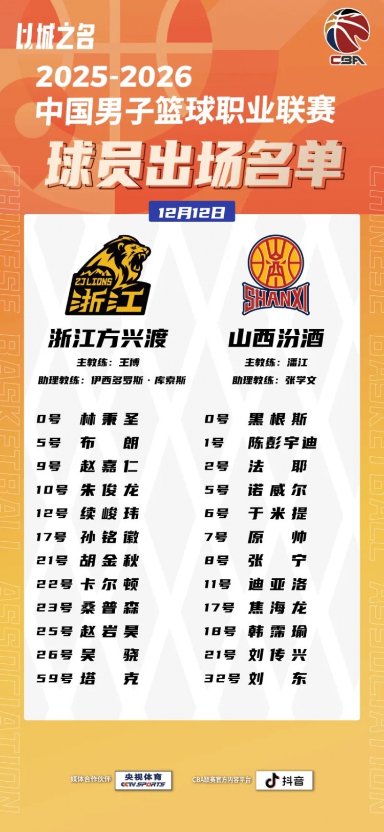 12月12日讯 19点35分,新赛季CBA常规赛揭幕战广厦对阵山西的比赛将开打,赛前官方公布了本场比赛两队的大名单。具体如下:广厦:林秉圣、小巴里·布朗、赵嘉仁、朱俊龙、续峻玮、孙铭徽、胡金秋、约书亚·卡尔顿、贾卡尔·桑普森、赵岩昊、吴骁、雷琼·塔克山西:阿什顿·黑根斯、陈彭宇迪、易卜拉希马·法耶、杰伦·诺威尔、于米提·赛达克、原帅、张宁、哈米杜·迪亚洛、焦海龙、韩霈瑜、刘传兴、刘东