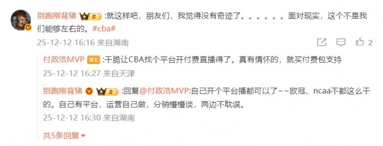 @别跑刚背猪 不看好双方的续约前景,对此付政浩表示:“干脆让CBA找个平台开付费直播得了。真有情怀的,就买付费包支持。”