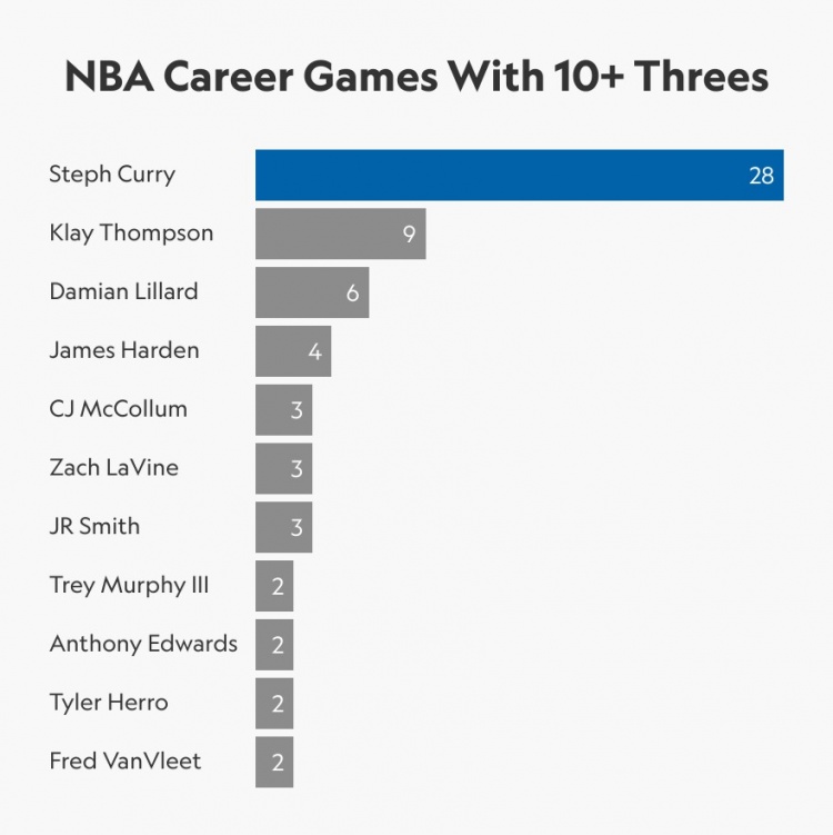 单场10+三分榜:库里28次断层领跑 克莱&利拉德&哈登分列二至四位