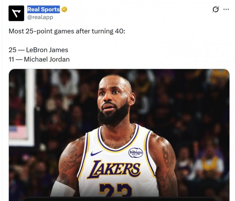 12月15日讯 NBA常规赛,湖人116-114险胜太阳。全场比赛,詹姆斯出战36分钟,17投8中,三分5中1,罚球14中9,砍下26分3篮板4助攻2抢断2盖帽,出现8失误,正负值+8。赛后美媒Real Sports晒出数据显示,詹姆斯40岁后已25次砍下25+,而乔丹共11次。