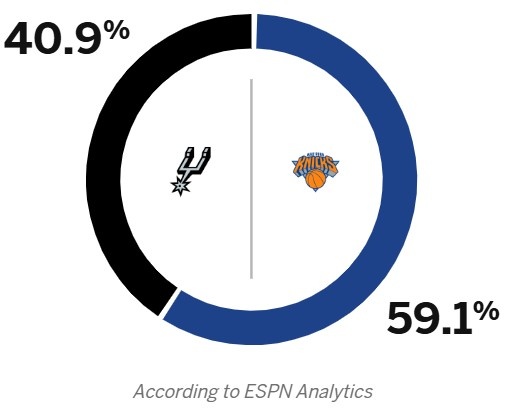 今天,ESPN预测本场比赛胜率,马刺40.9%,尼克斯59.1%。