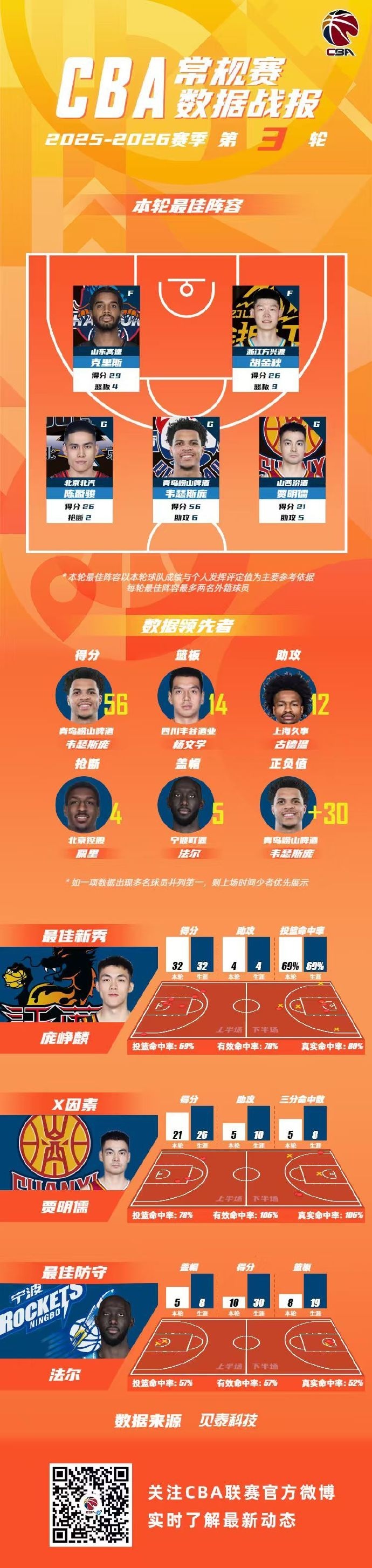 2025-2026赛季CBA联赛常规赛第3轮结束较量,来自山东高速篮球俱乐部的克里斯,浙江广厦篮球俱乐部的胡金秋,北京首钢篮球俱乐部的陈盈骏,青岛国信海天篮球俱乐部的韦瑟斯庞和山西汾酒职业篮球俱乐部的贾明儒入选CBA联赛常规赛第3轮最佳阵容!