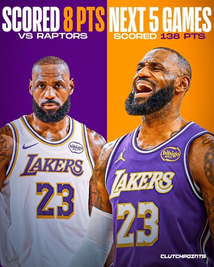 湖人媒体lakeshowcp晒图写道:勒布朗·詹姆斯在对阵多伦多猛龙的比赛中仅得8分,结束了他历史性的连续得分上双纪录。但这位传奇球员以一种只有他才能做到的方式做出了回应。自那场罕见的个位数得分比赛以来,勒布朗在接下来的五场比赛中总共砍下了138分,这一成绩在同期NBA所有球员中排名第七。这无疑是一次顶尖的反弹表现,展现了他真正的竞技精神。即使是在他的第23个赛季,这位“国王”依然展现出他依然是联盟中最具有统治力的球员之一。你若激怒了国王,必将见到他最出色的表现!