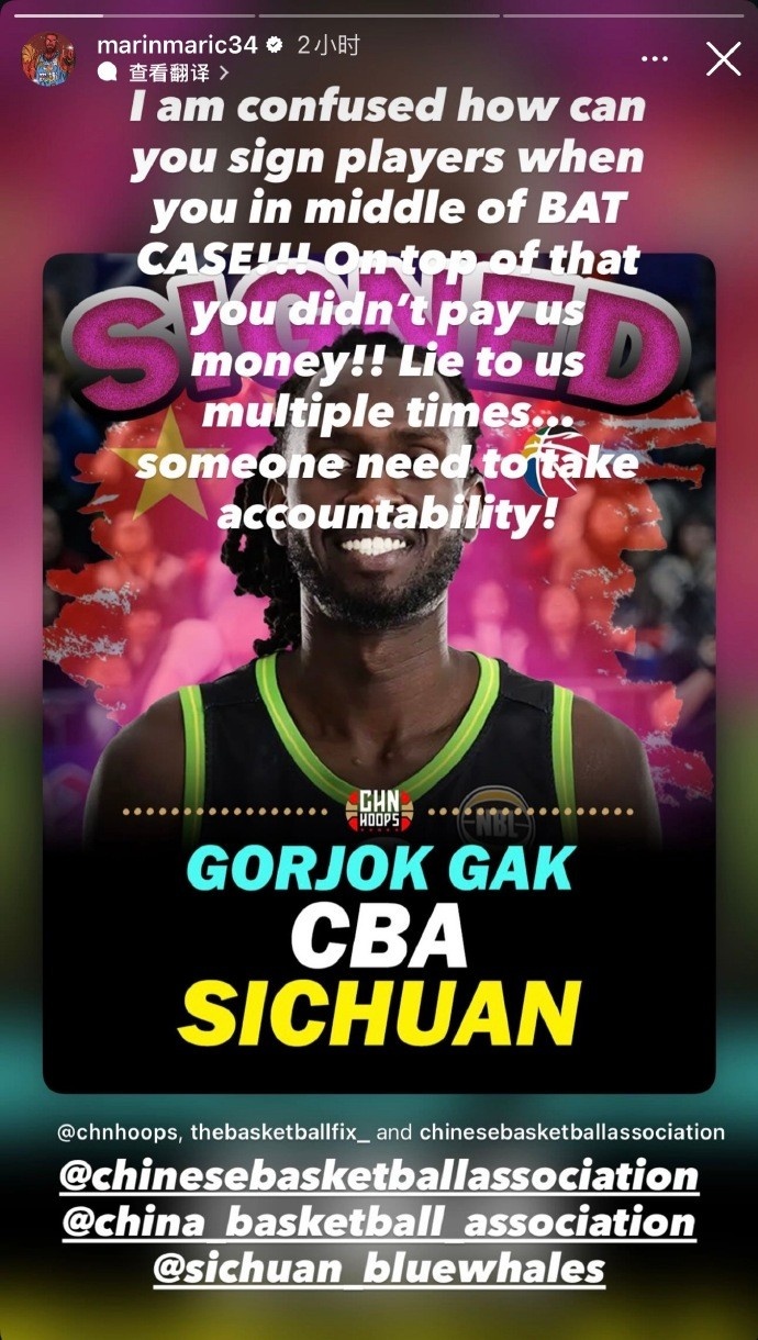 12月23日讯 深圳男篮外援马里奇更新社媒,声讨老东家四川男篮。马里奇晒出一张四川男篮签下新外援的相关图片,并在图片中写道:“我很困惑,你们怎么能在处于破产边缘时还能签球员?此外,你们还没付我们拖欠的薪水!多次欺骗我们……有人需要出来负责。”马里奇上赛季效力于四川男篮,上赛季场均18分10.7篮板。