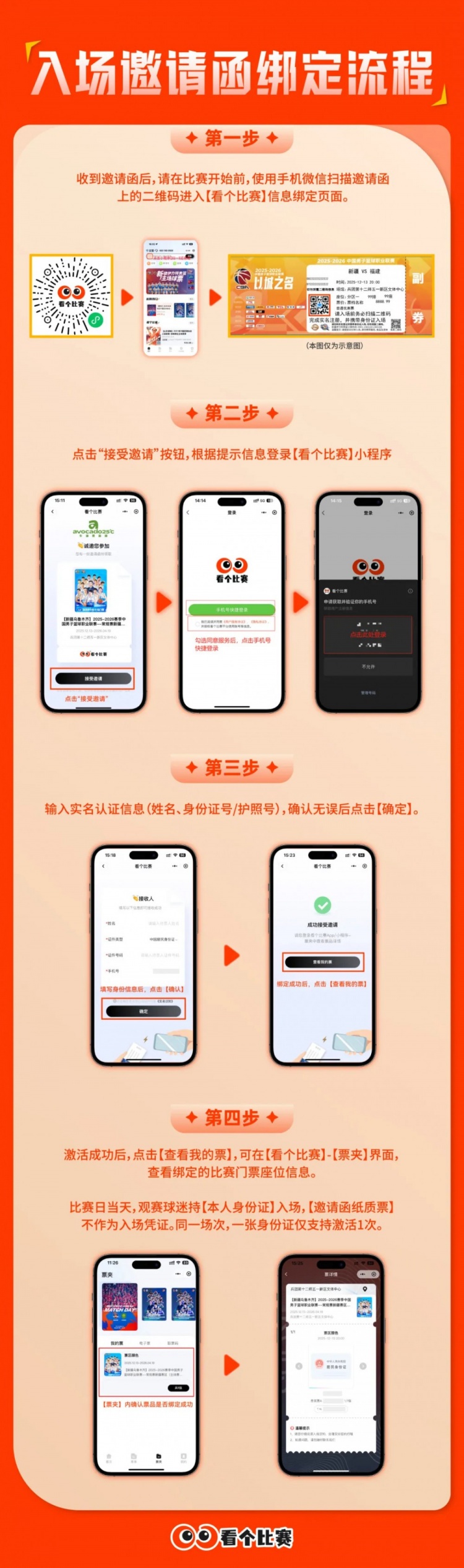 新疆伊力特男篮主场实行“强实名”入场规则,邀请函不作为唯一入场凭证。球迷购买邀请函后,需提前扫描“邀请函”上的二维码完成实名信息注册,注册后携带本人身份证原件及“邀请函”入场观赛。