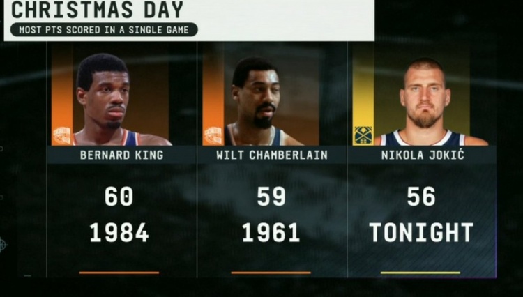 12月26日讯 NBA圣诞大战,掘金142-138赛季三杀森林狼,约基奇加时18分。本场,约基奇出战43分钟,投篮21中15,三分6中4,罚球23中22,砍下56分16篮板15助攻2盖帽,正负值+15!56分是NBA历史圣诞大战第三高分,仅次于伯纳德·金(60分)和张伯伦(59分)。