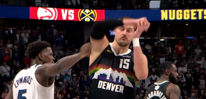 这里已放你一马了!华子伸手扒拉约基奇又装作若无其事 裁判没吹~