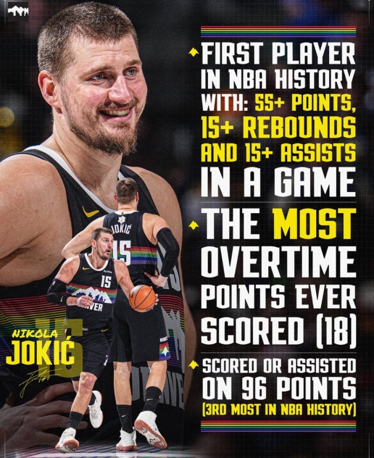 12月27日讯 NBA圣诞大战,掘金142-138赛季三杀森林狼。本场,约基奇出战43分钟,投篮21中15,三分6中4,罚球23中22,砍下56分16篮板15助攻2盖帽,正负值+15!本场比赛,约基奇通过自己得分和助攻,合计为掘金贡献了96分,历史第三高,第一高是张伯伦的104分(100分2助攻),第二为多诺万·米切尔的100分(71分11助攻)。