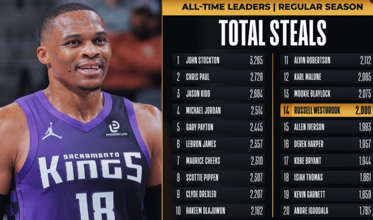 目前,威少已经送出了1次抢断,他的常规赛生涯抢断总数突破2000大关,历史第14人。