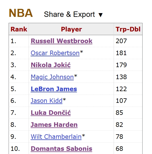 12月28日讯 掘金客场战魔术,第三节,约基奇达成三双。这是约基奇本赛季31场比赛第16个三双,也是他职业生涯第180个三双。约基奇生涯三双数距离历史第二的大O仅差1个,而距离历史第一的威少也仅差27个!三双历史前10如下:1、威少 207次2、大O 181次3、约基奇 180次4、魔术师约翰逊 138次5、詹姆斯 122次6、基德 107次7、东契奇 85次8、哈登 82次9、张伯伦 78次10、小萨博尼斯 68次