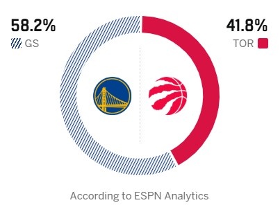 ESPN对本场比赛两队胜率进行预测:勇士58.2% ,猛龙41.8%。