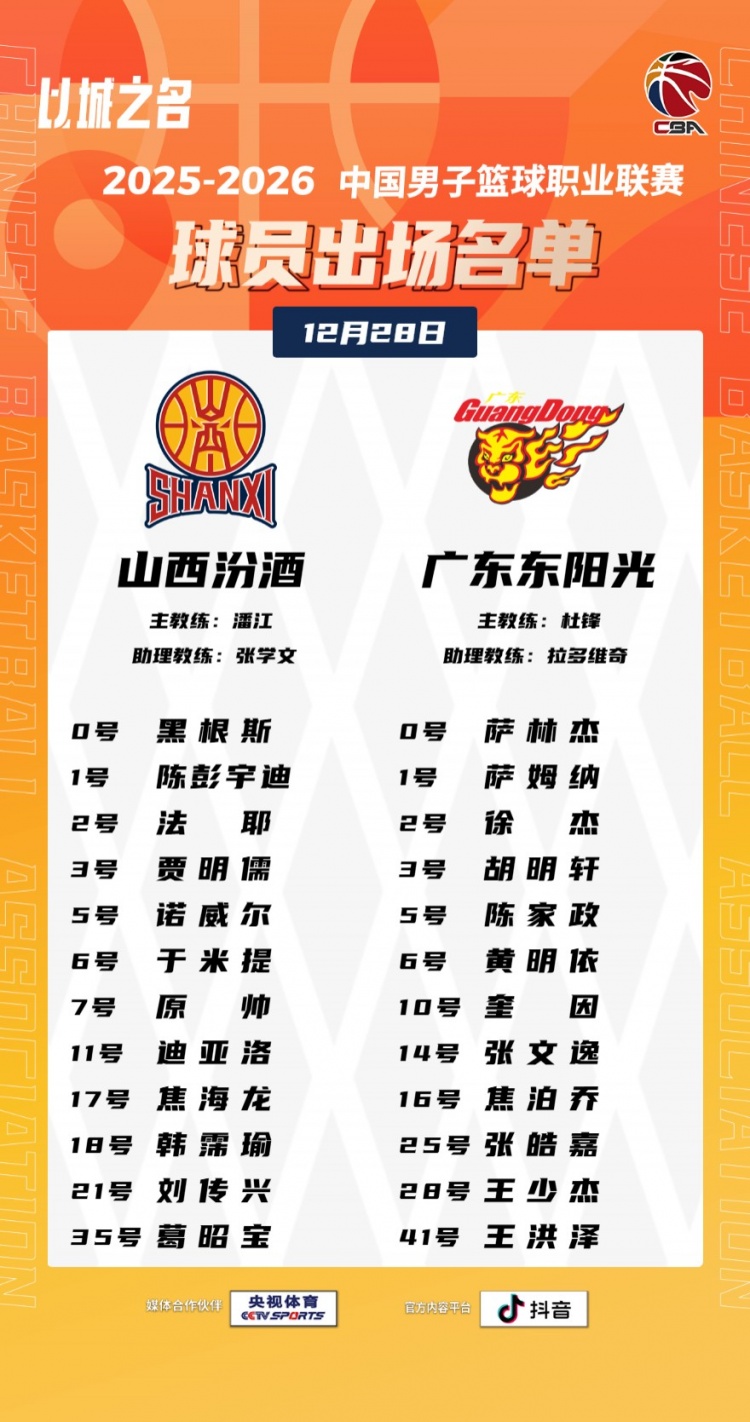 12月28日讯 CBA常规赛今晚上演晋粤大战,山西主场迎战广东。赛前大名单出炉,胡明轩在其中,张宁缺阵,具体如下:山西:黑根斯、陈彭宇迪、法耶、贾明儒、诺威尔、于米提、原帅、迪亚洛、焦海龙、韩霈瑜、刘传兴、葛昭宝广东:萨林杰、萨姆纳、徐杰、胡明轩、陈家政、黄明依、奎因、张文逸、焦泊乔、张皓嘉、王少杰、王洪泽