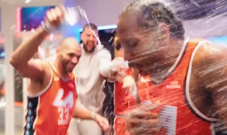 GIF-快船更衣室泼水小卡疯狂庆祝12月29日讯 NBA常规赛,快船在主场以112-99击败活塞,豪取四连胜。此役,莱昂纳德出战38分37秒,投篮26中17,三分10中5,罚球17中16,得到55分11篮板2助攻5抢断3盖帽。赛后,快船更衣室疯狂泼水庆祝,莱昂纳德浑身被浇透。