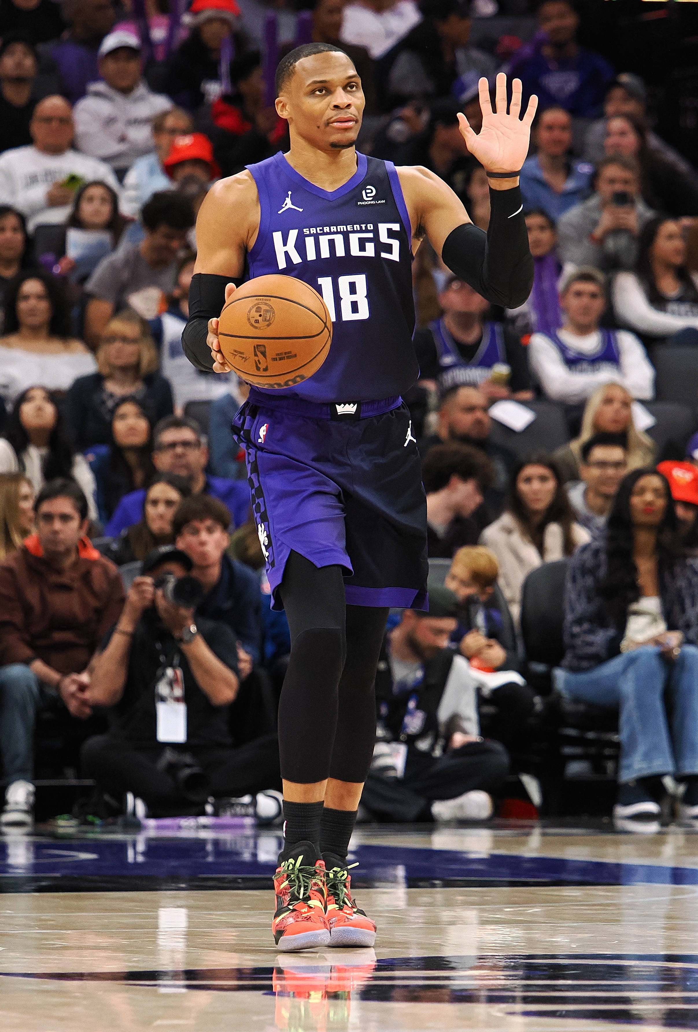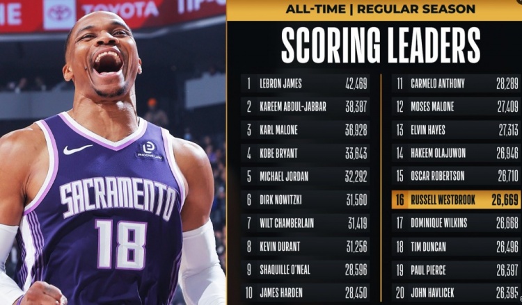 12月29日讯 NBA常规赛,国王101-125不敌湖人。本场比赛,威少出战26分钟,投篮17中6,三分球5中1,拿到13分5篮板4助攻2抢断的。值得一提的是,在近期的比赛中,威少在得分、篮板、助攻和抢断上皆迎来里程碑,详情如下:篮板:威少总篮板数超越瓦兰丘纳斯,上升至NBA历史第60位;抢断:威少总抢断数突破2000次,NBA历史第14人;助攻:威少总助攻数超越魔术师约翰逊,上升至NBA历史第7位;得分:威少总得分数超越多米尼克·威尔金斯,上升至NBA历史第16位。
