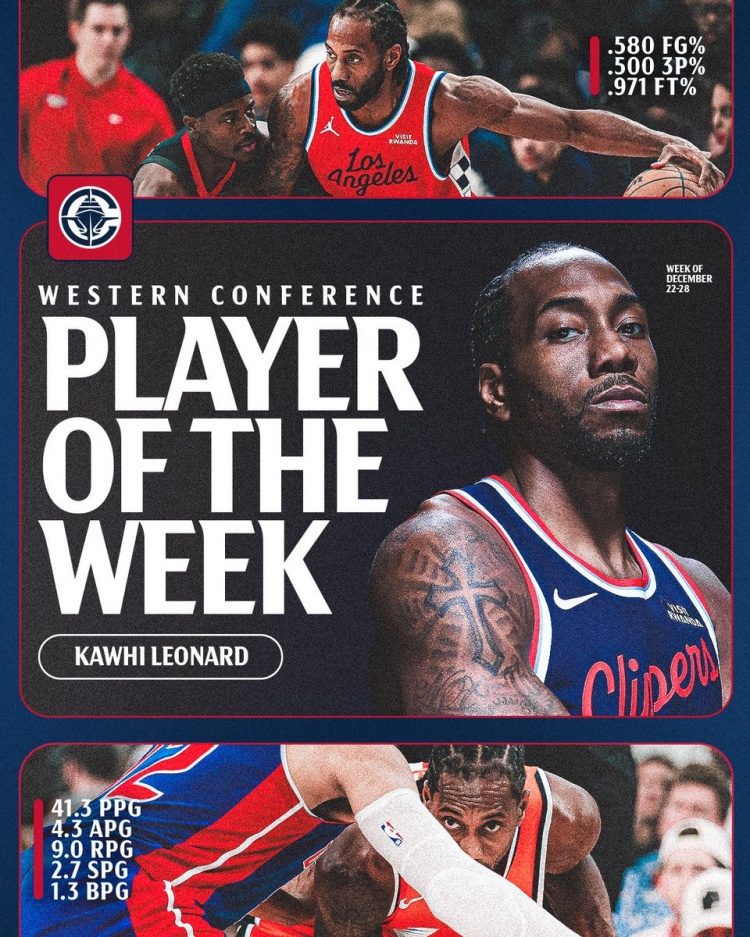 12月30日讯 今日NBA官方宣布,快船球星莱昂纳德当选西部周最佳球员。快船官方发布小卡西部周最佳海报,据统计,这是小卡生涯第11次拿下周最佳,也是快船生涯的第5次!相关新闻>>>小卡上周场均轰41.3分9板4.3助2.7断1.3帽 命中率高达58/50/97.1%