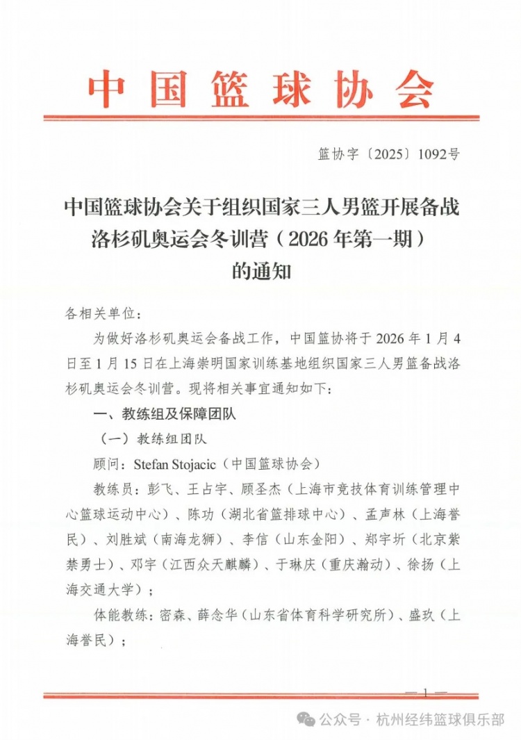 近日,中国篮球协会公布国家三人男篮备战洛杉矶奥运会冬训营名单,我俱乐部多人入选,其中,管理保障组1人(孙毅)、运动员3人(王昊天、戴江旭、游毅超)