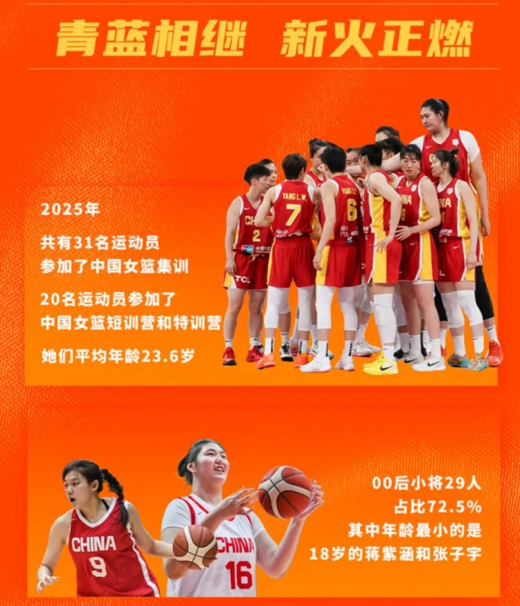 12月30日讯 中国篮球之队发布了2025年的年终盘点。其中,2025年一共有31名女子运动员参与了中国女篮集训,20名女子运动员参加了中国女篮短训营和特训营,他们的平均年龄为23.6岁。其中00后小将29人,占比72.5,年龄最小的是18岁的蒋紫涵和张子宇。