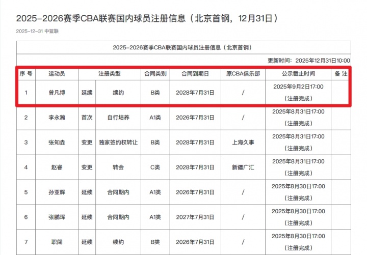 12月31日讯 今日,CBA官方更新球员注册信息,北京已为曾凡博完成注册。