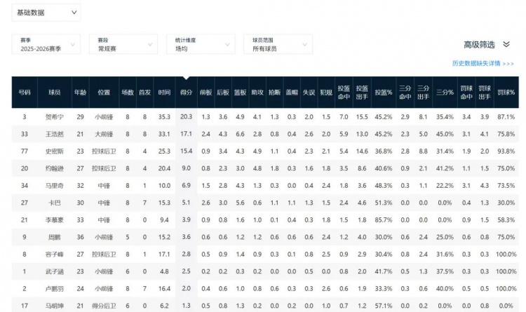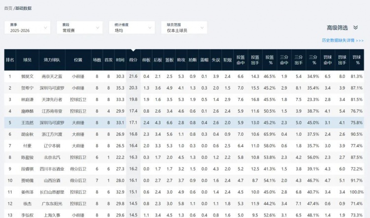 当然,能有这个冲锋的空间,主要还是因为王浩然今年三分大踏步的进步,命中率从30%一口气冲到45%,场均出手达到5次。
