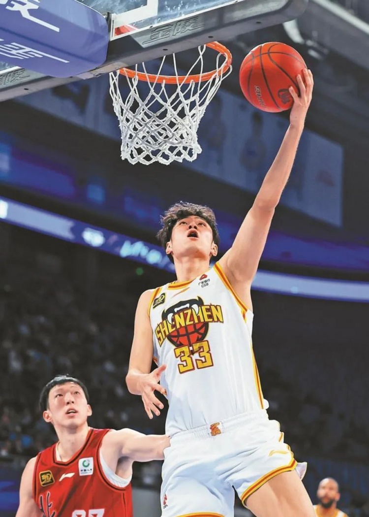而深圳队针对这个特点,干脆让他在防守端扮演底线游荡者,负责给对球施压的中锋补位(然后可以的话再扫荡出去)。