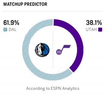 1月8日讯 明天上午10:00,独行侠将客场对阵爵士。ESPN今日给出本场比赛获胜概率预测,独行侠为61.9%,爵士为38.1%。目前独行侠14胜23负排名西部第11,近期2连胜;爵士12胜24负排名西部第13,近期遭遇5连败。